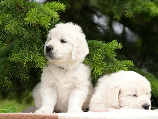 Wallpaper Two puppies of a golden retriever at a green spruce branch