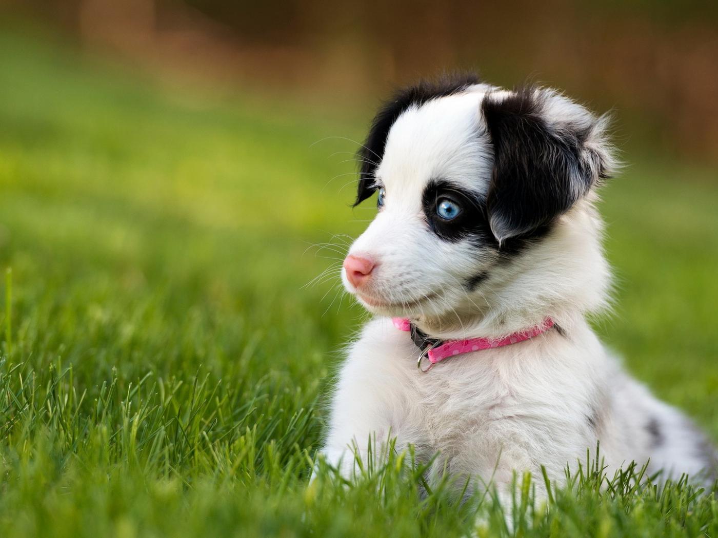 Wallpaper Funny puppy with blue eyes sitting in green grass