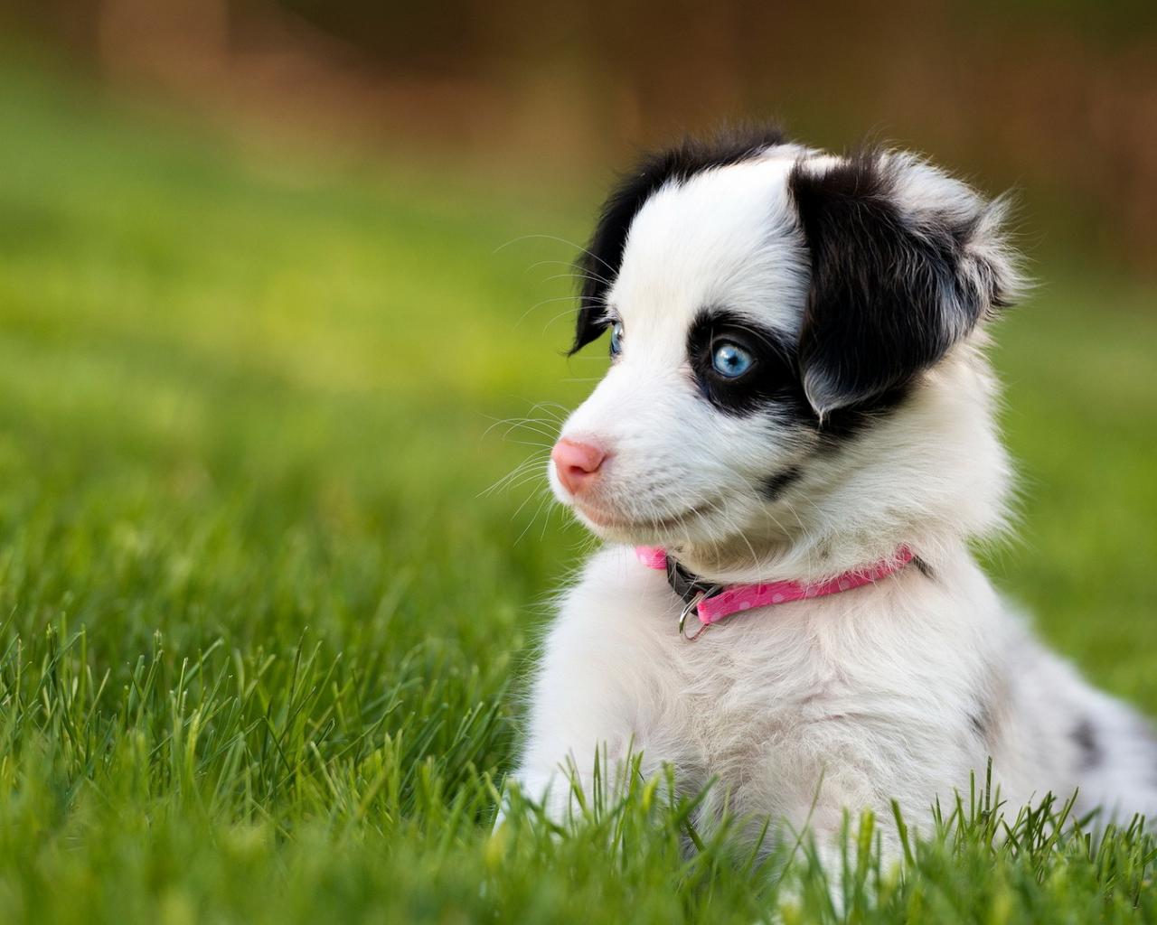Wallpaper Funny puppy with blue eyes sitting in green grass