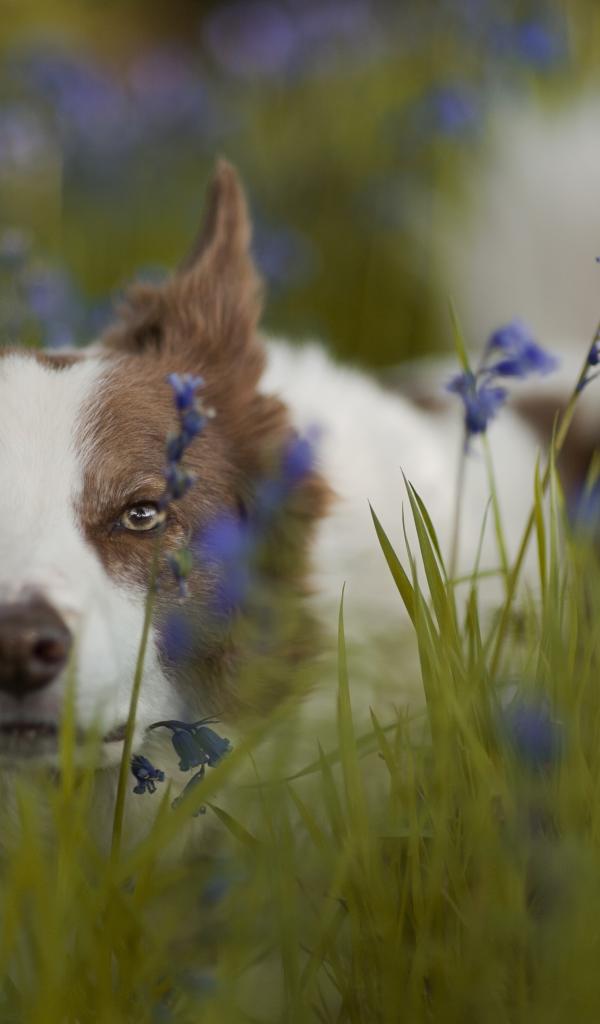 Wallpaper Dog breeds of Border Collie lies in blue wildflowers