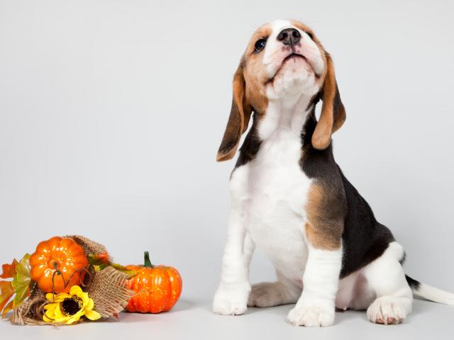 Wallpaper Little puppy beagle posing on a gray background