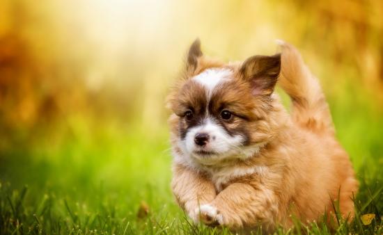 Wallpaper Funny welsh corgi puppy running along the green grass