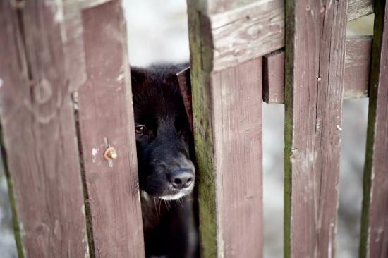 Wallpaper A curious black dog peers into the gap in the fence
