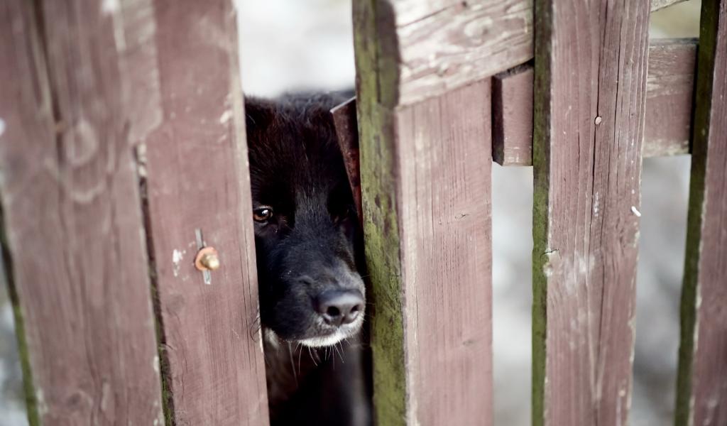 Wallpaper A curious black dog peers into the gap in the fence