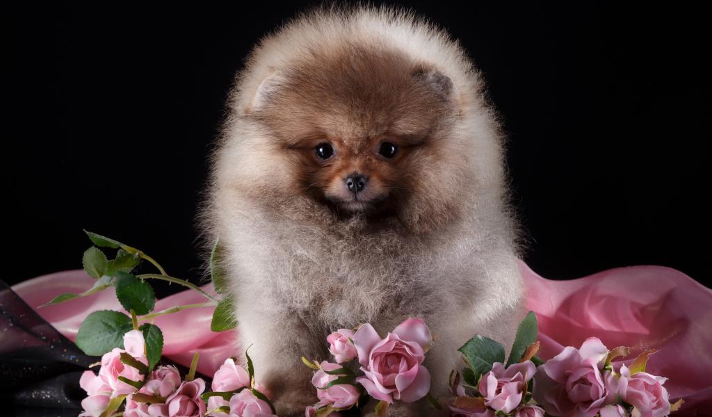 Wallpaper Fluffy pomeranian with flowers roses on a black background