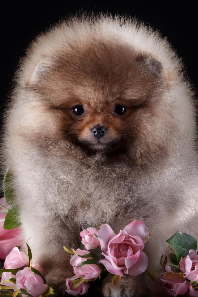 Wallpaper Fluffy pomeranian with flowers roses on a black background