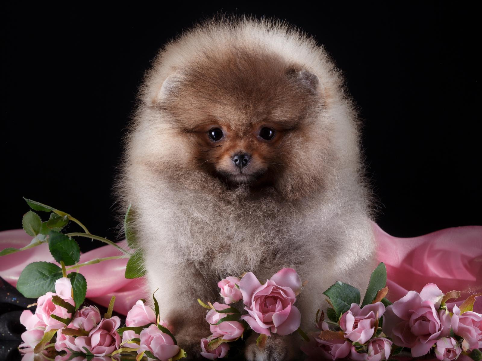 Wallpaper Fluffy pomeranian with flowers roses on a black background