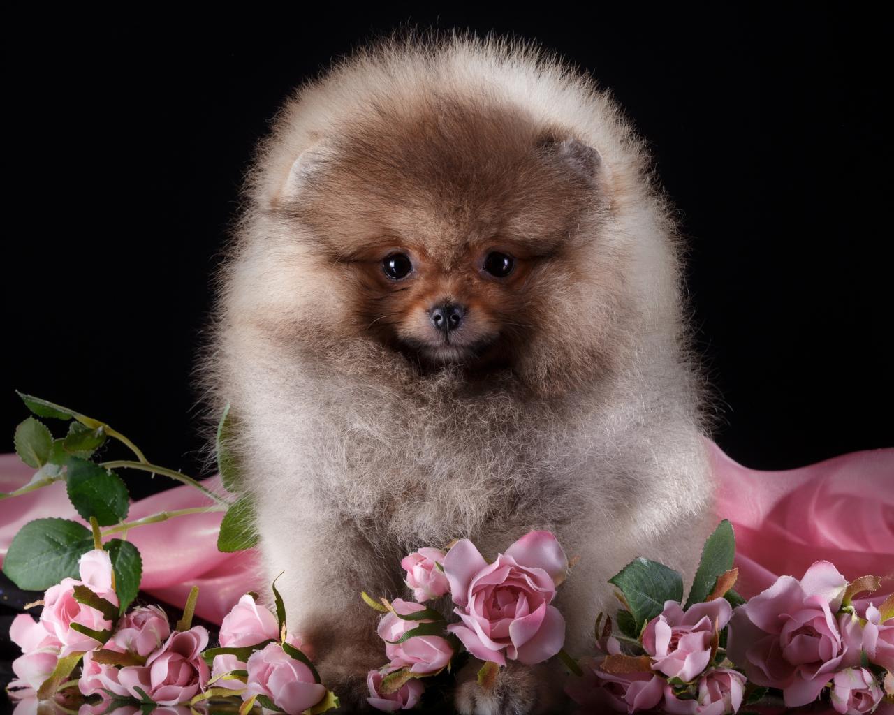 Wallpaper Fluffy pomeranian with flowers roses on a black background
