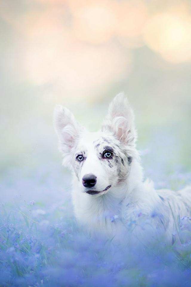 Wallpaper The Australian Shepherd wanders through the blue field flowers