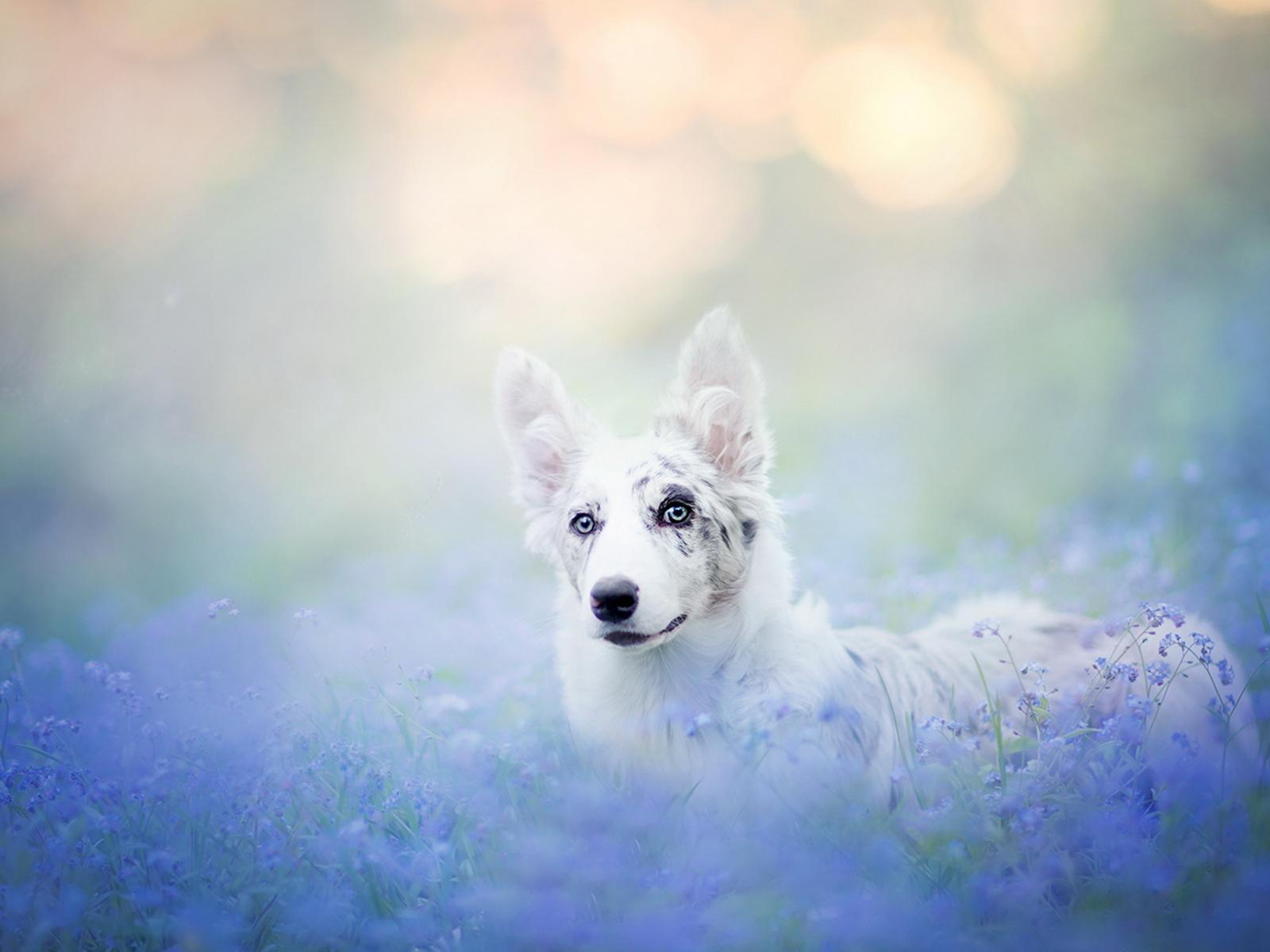 Wallpaper The Australian Shepherd wanders through the blue field flowers