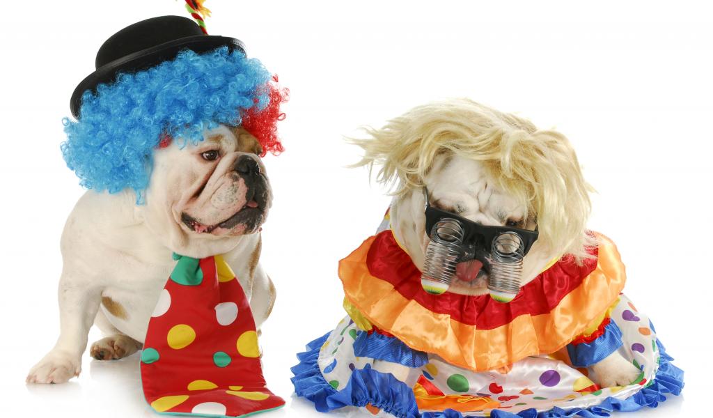 Wallpaper Two english bulldogs in fancy dresses on a white background