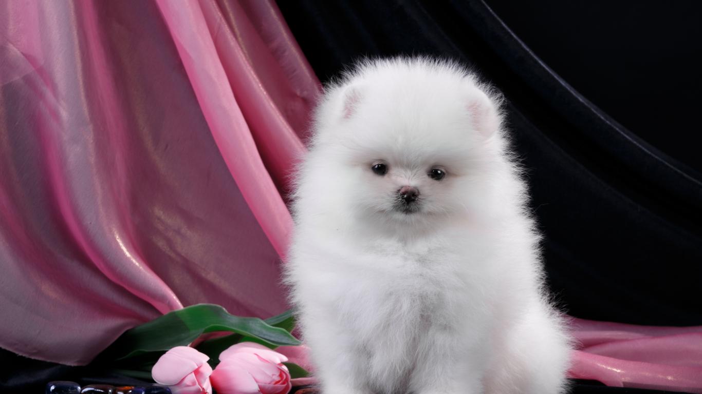 Wallpaper Fluffy white pomeranian with pink tulips