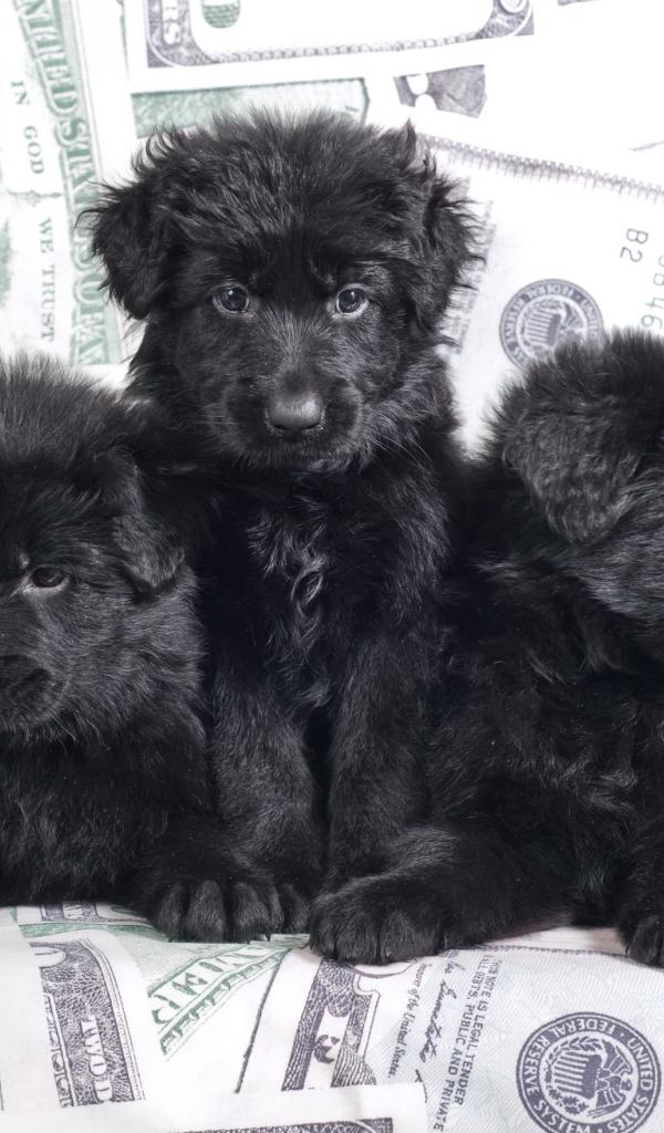 Wallpaper Three black sheepdog puppies lie on the couch