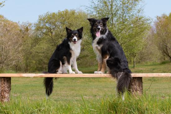 Wallpaper Two Border Collie breed dogs sit on a wooden bench