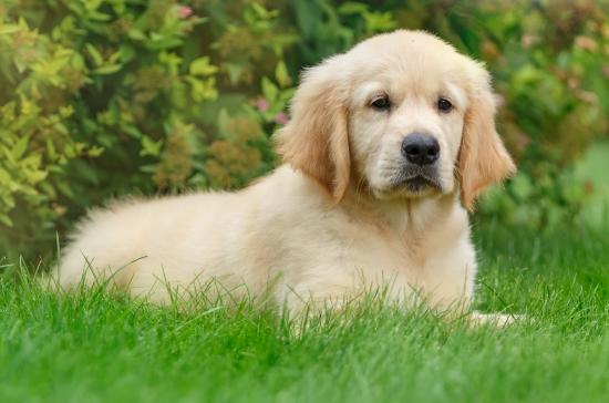 Wallpaper Puppy of golden retriever lies on green grass