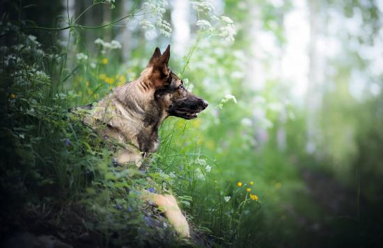 Wallpaper German Shepherd Sits in an Ambush in Green Grass