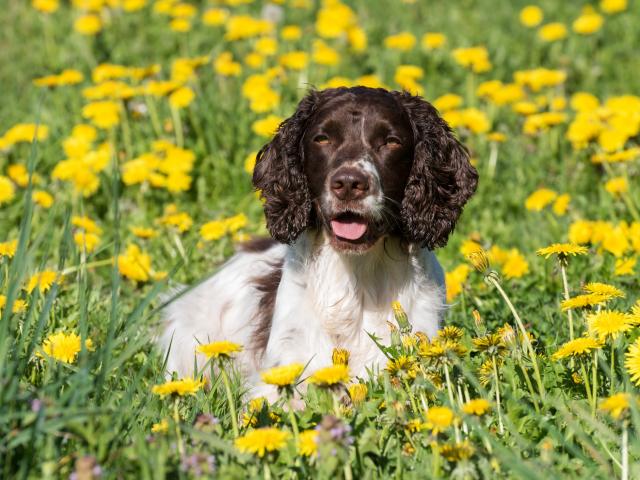 Wallpaper The Cocker Spaniel lies in the yellow colors of the dandelion