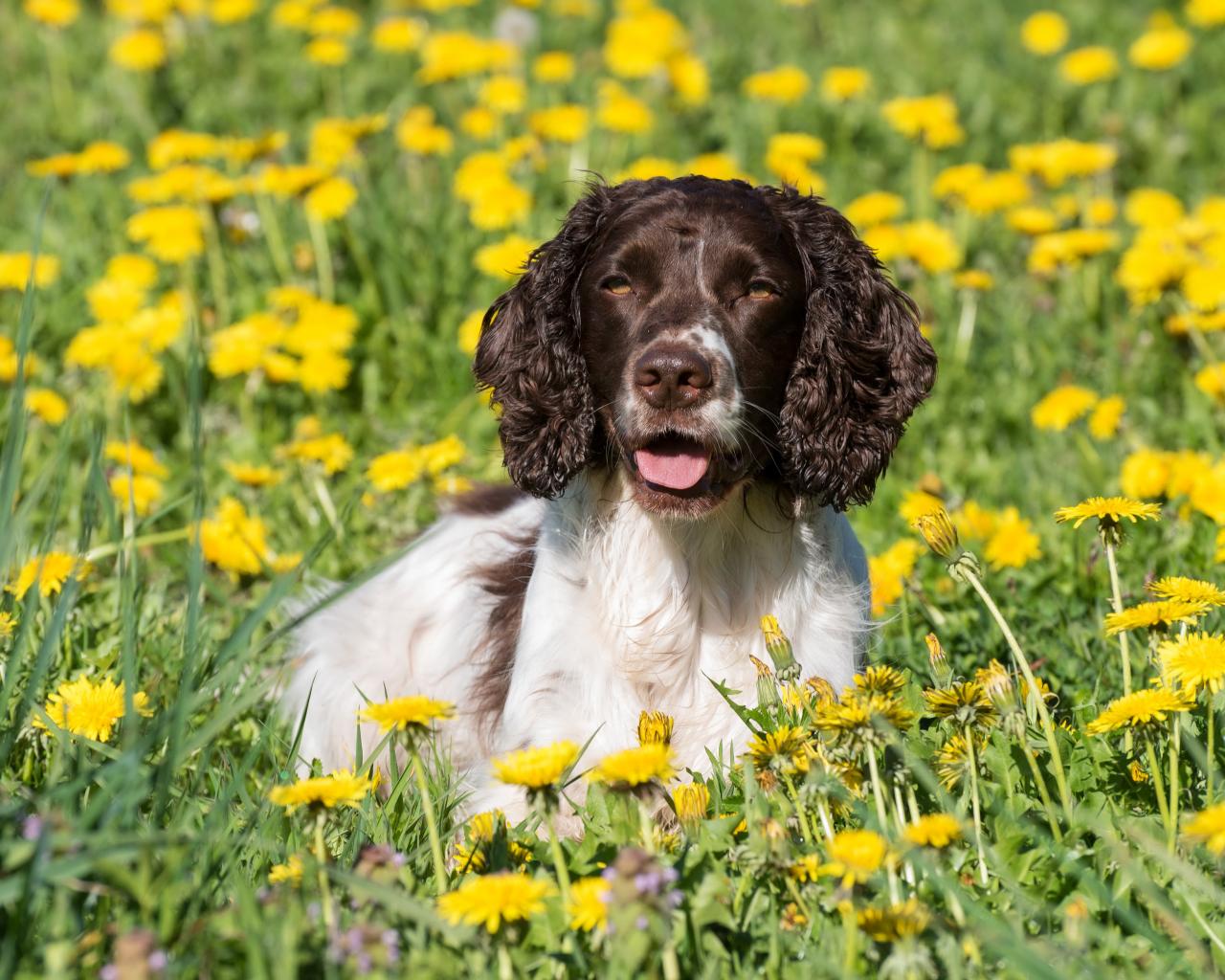 Wallpaper The Cocker Spaniel lies in the yellow colors of the dandelion