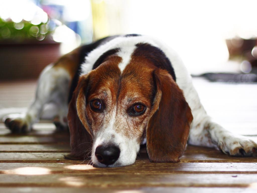 Wallpaper A sad beagle dog lies on the wooden floor