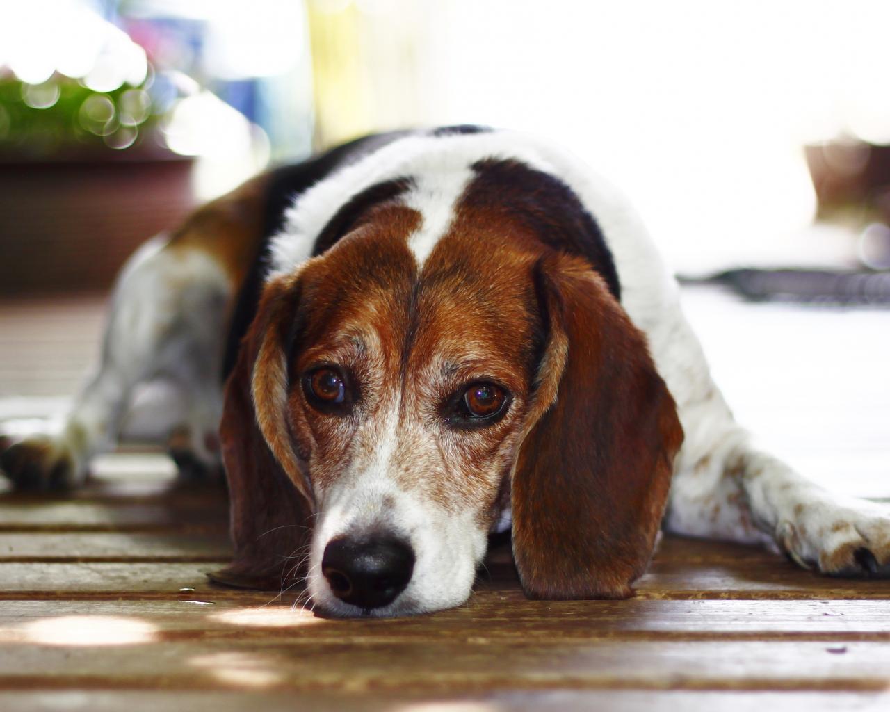 Wallpaper A sad beagle dog lies on the wooden floor