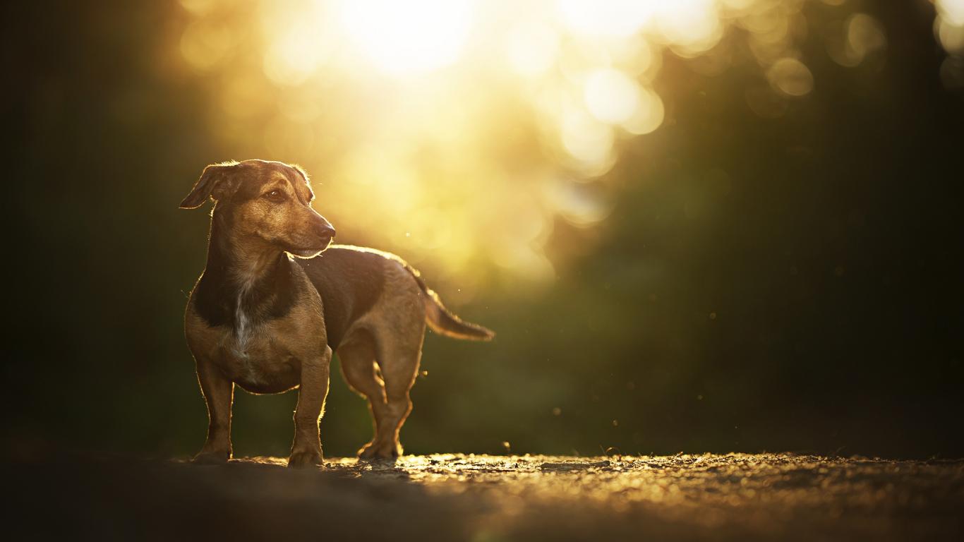 Wallpaper A sad dachshund stands on the road at sunset