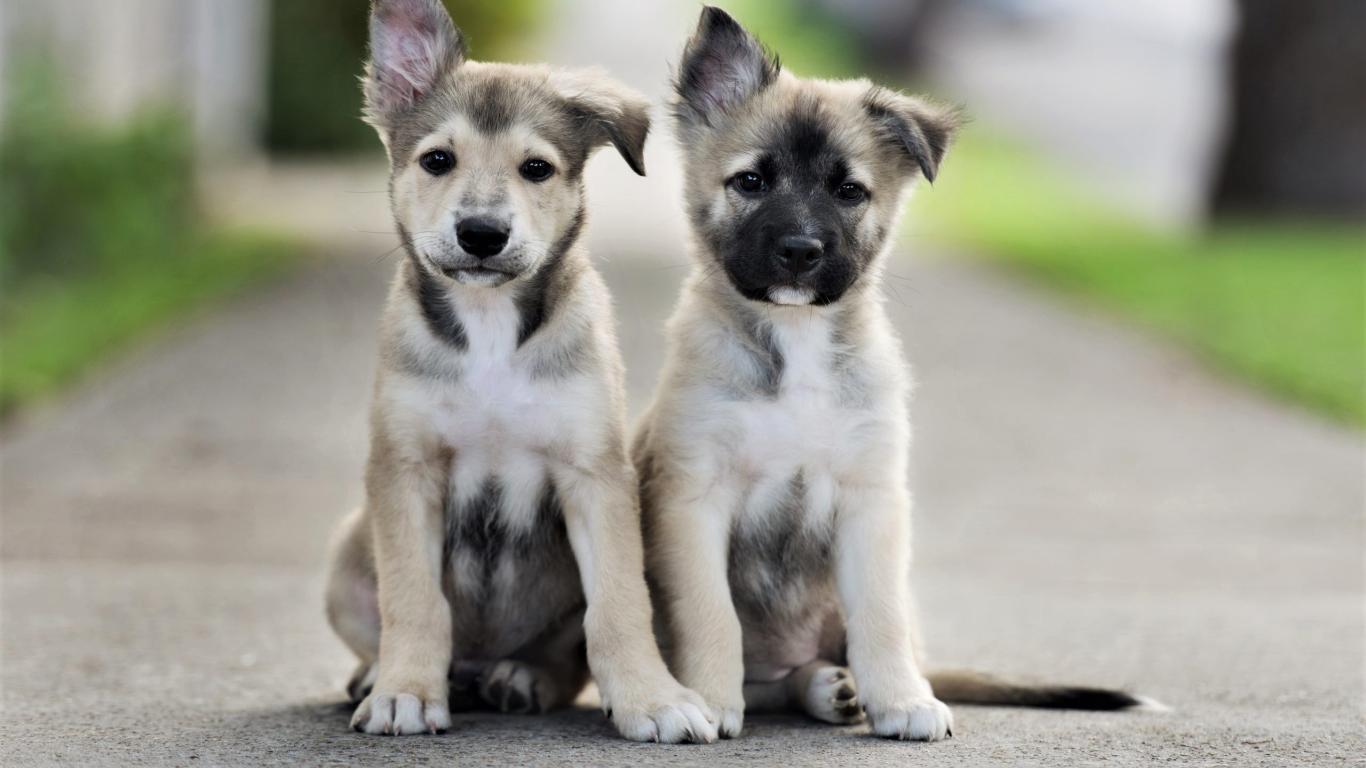 Wallpaper Two little cute puppies sitting on the road