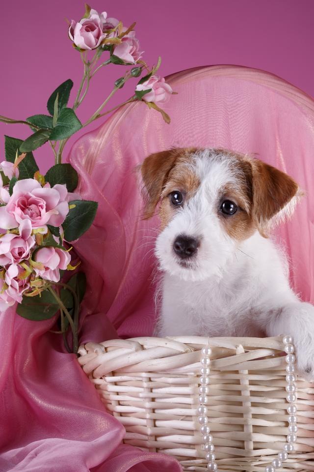 Wallpaper Puppy silichem-terrier in a pink basket with flowers