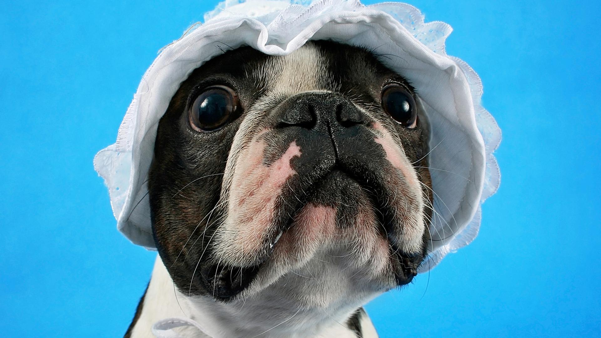 Wallpaper Boston Terrier in a white hat on a blue background