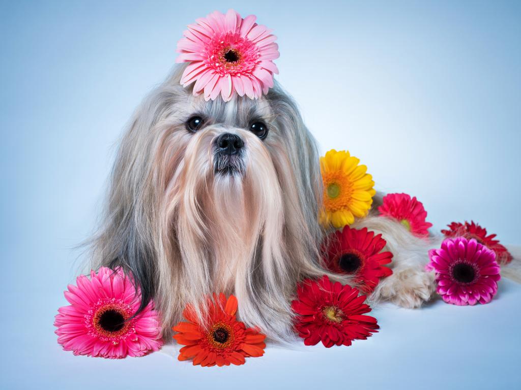 Wallpaper Sweet dog breed shih-tzu with multi-colored gerbera flowers