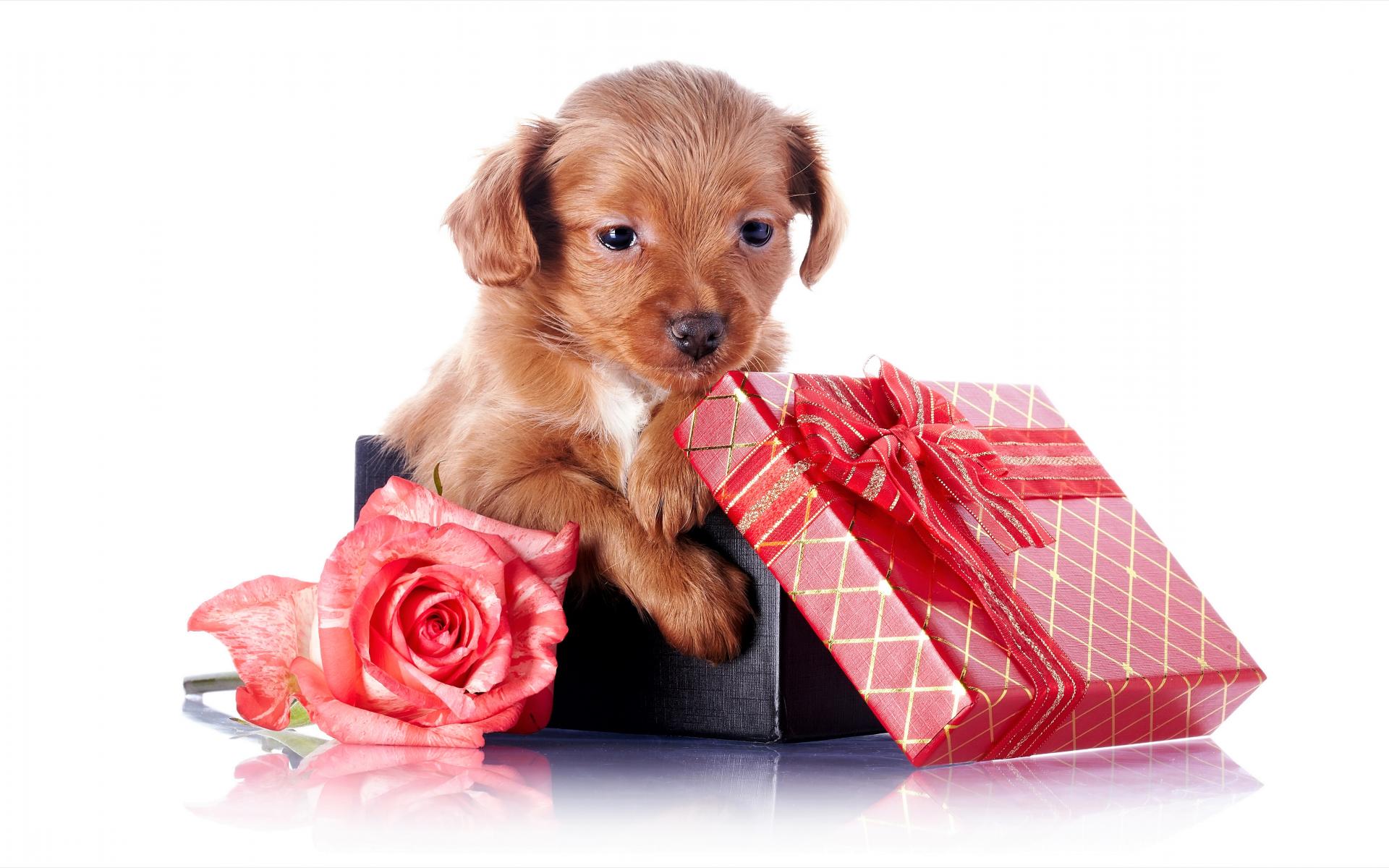 Wallpaper Little puppy in a gift box with a rose on a white background