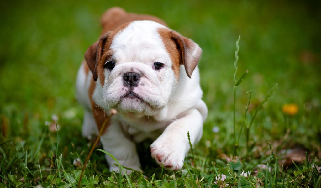 Wallpaper Puppy English bulldog running on green grass