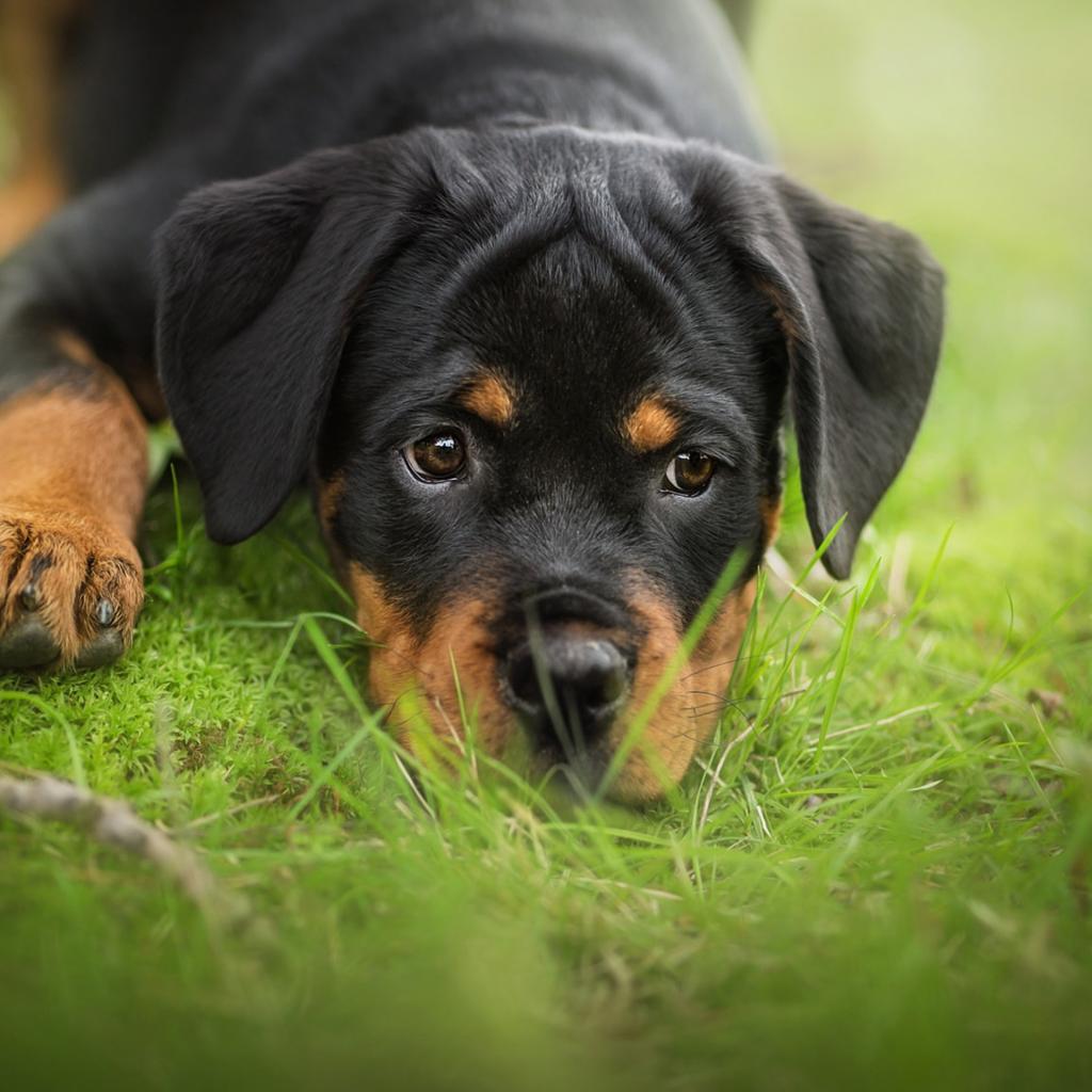Wallpaper A sad Rottweiler puppy lies on the green grass