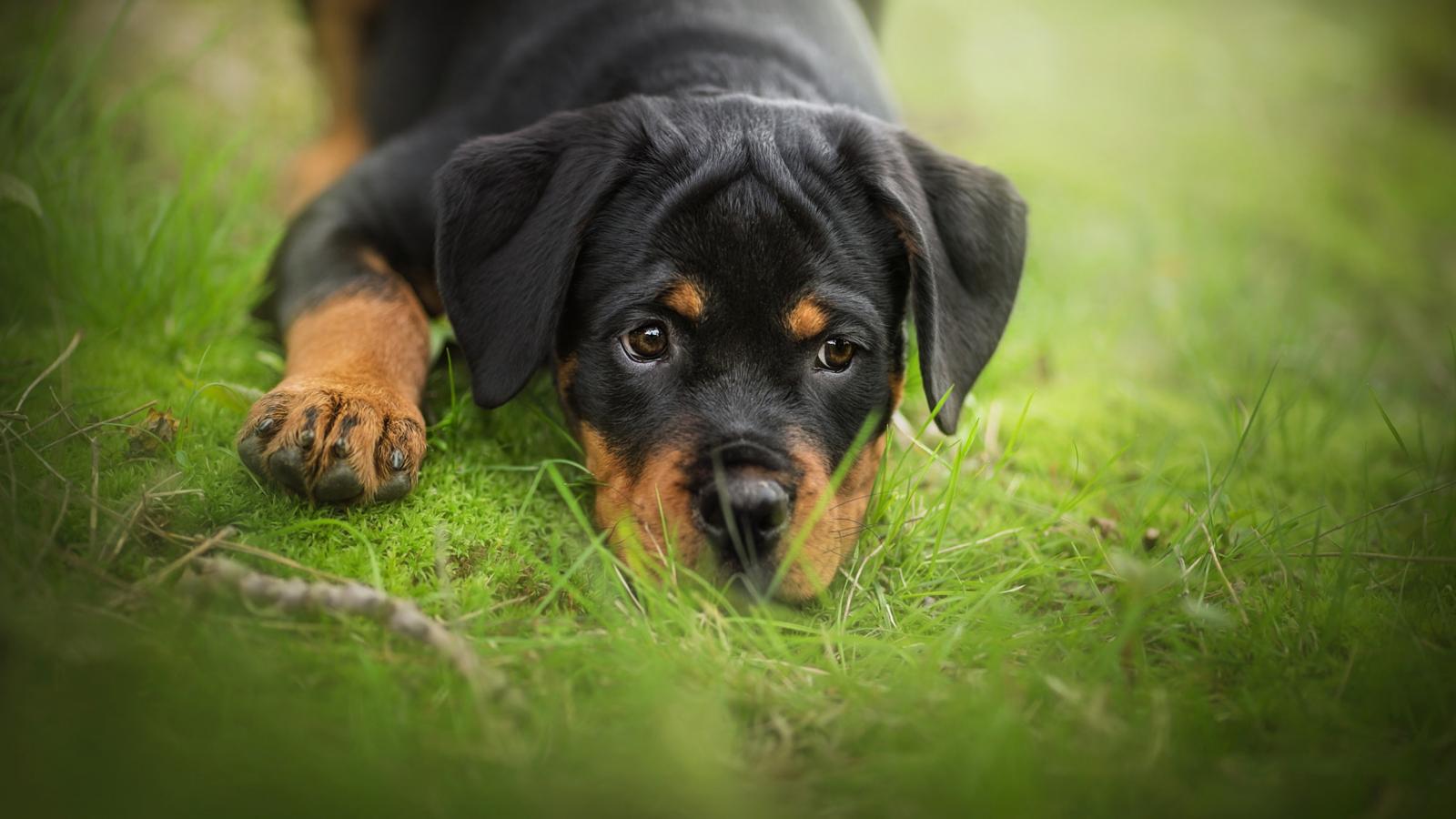Wallpaper A sad Rottweiler puppy lies on the green grass