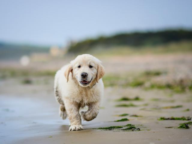 Wallpaper A small puppy of a golden retriever runs through the wet sand