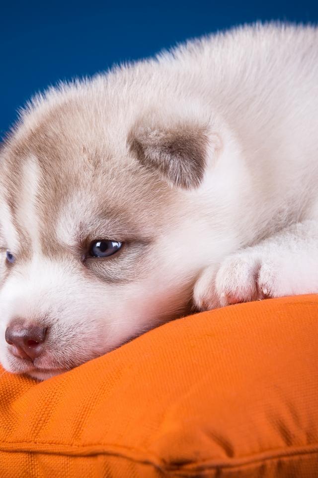 Wallpaper A small sad Husky puppy lies on a pillow
