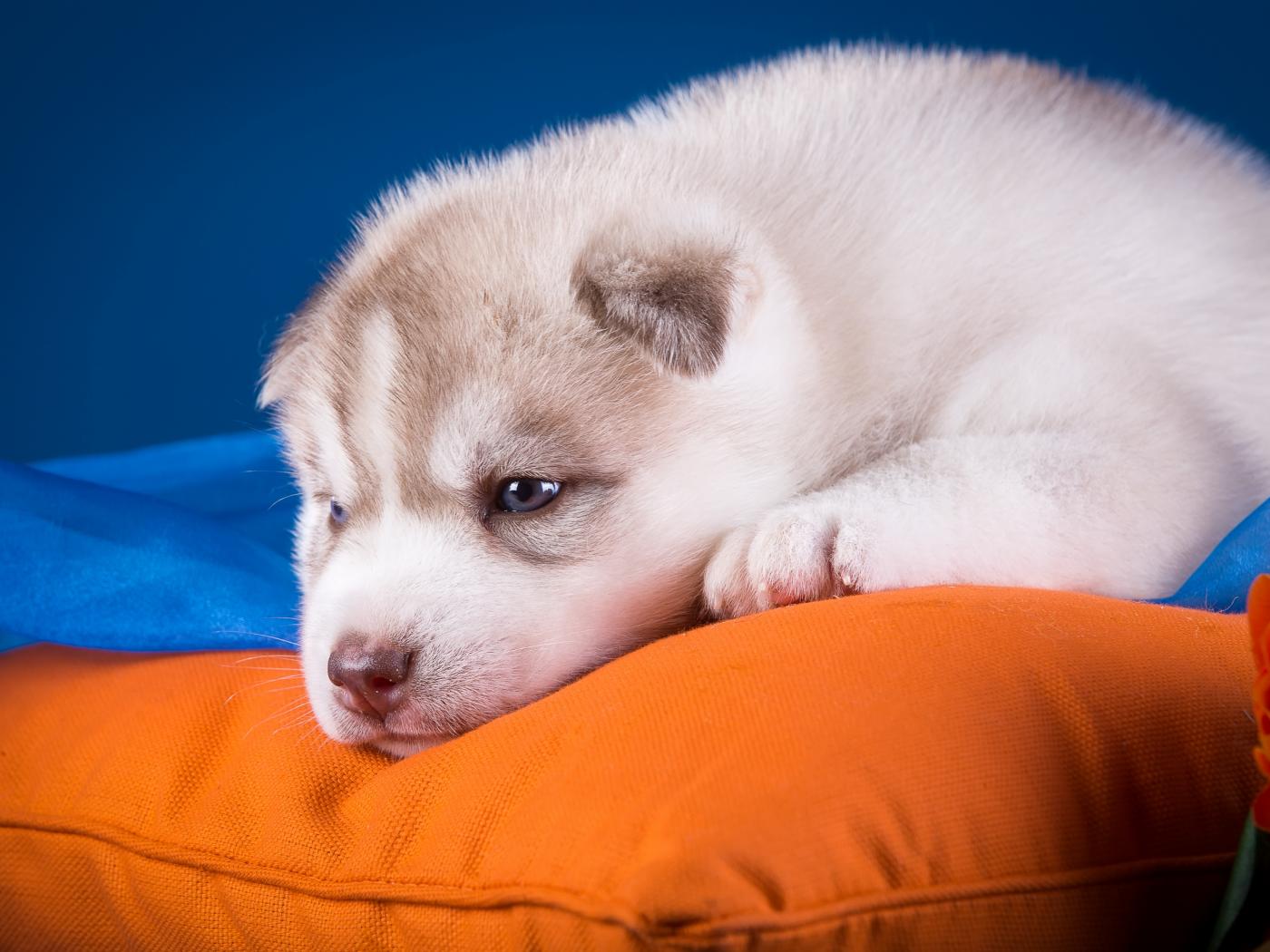 Wallpaper A small sad Husky puppy lies on a pillow