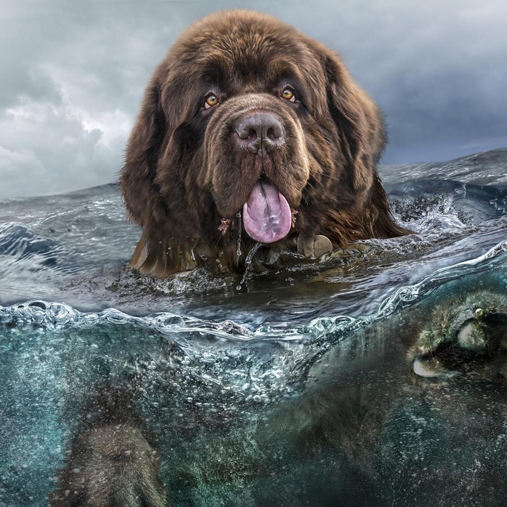 Wallpaper A large Newfoundland breed dog swims in the water
