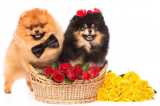 Wallpaper Two dogs of Pomeranian breed with red and yellow roses