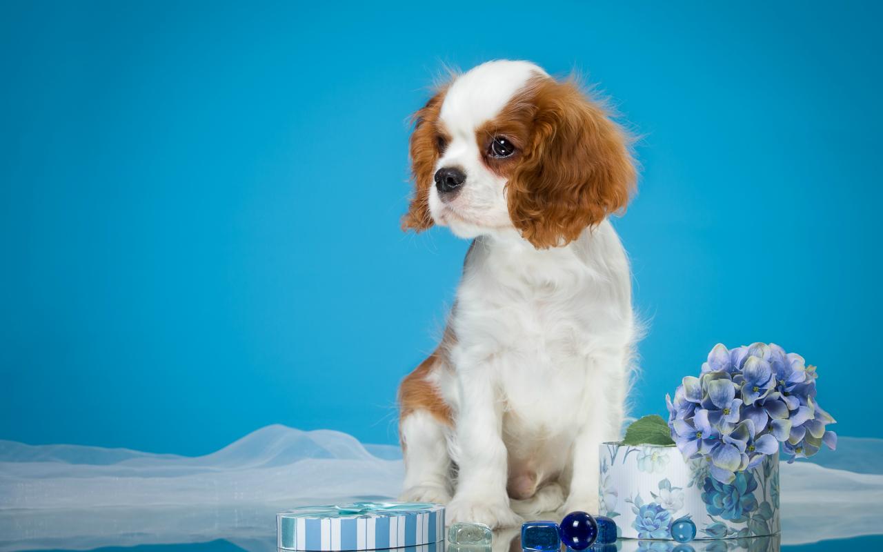 Wallpaper Puppy King Charles Spaniel on a blue background