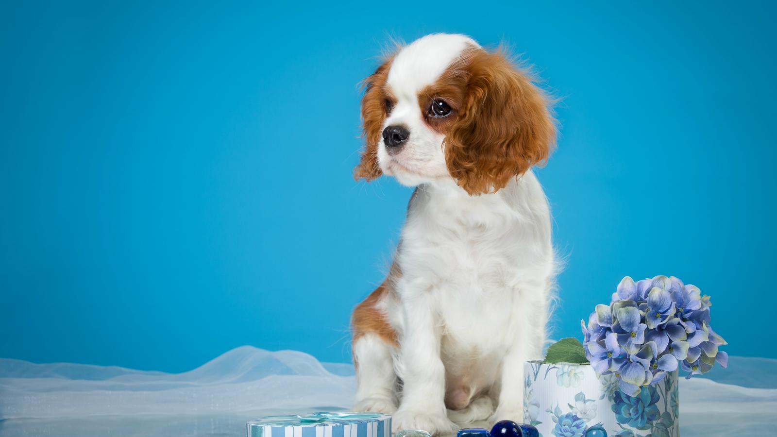Wallpaper Puppy King Charles Spaniel on a blue background
