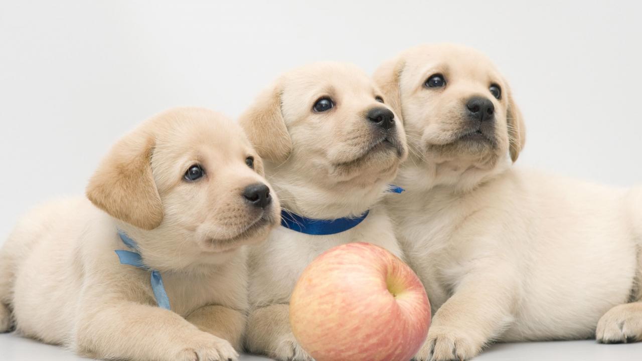 Wallpaper Three funny puppies of a golden retriever with an apple