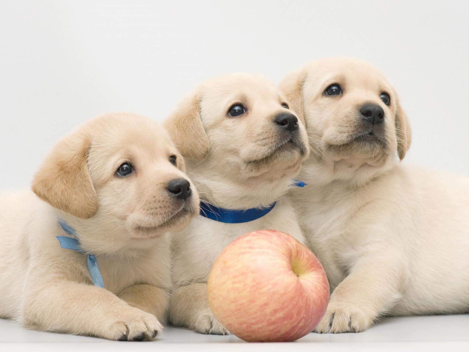Wallpaper Three funny puppies of a golden retriever with an apple