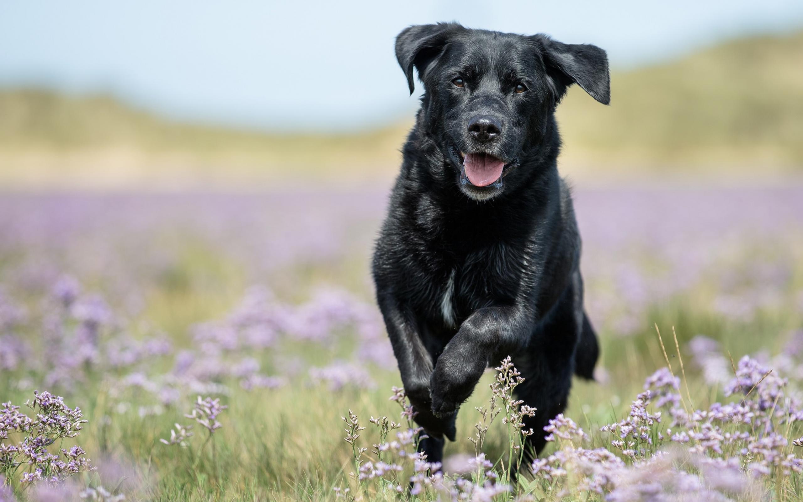 Wallpaper Black Labrador runs through the field flowers