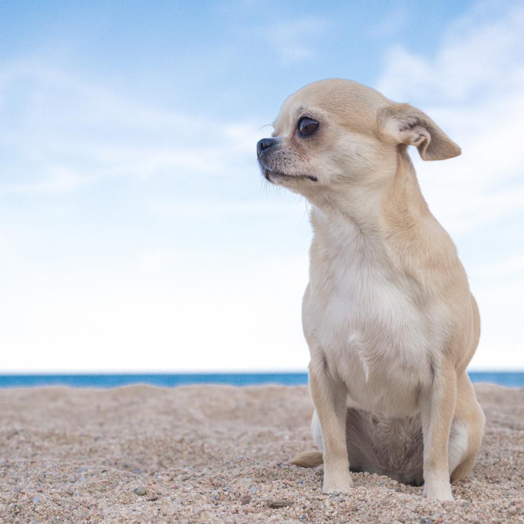 Wallpaper Sad chihuahua sits on the sand by the sea