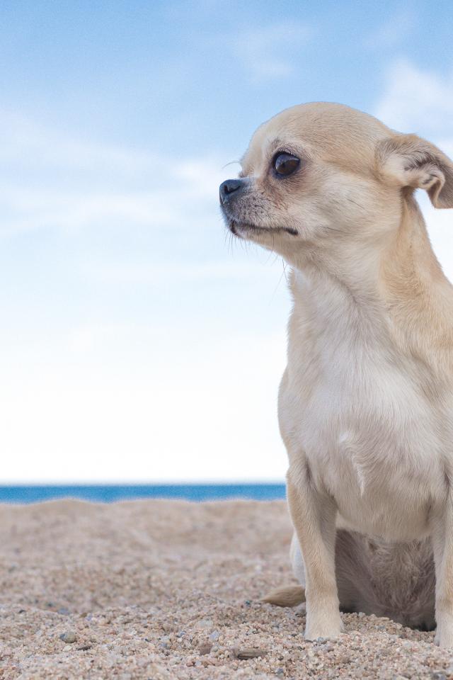 Wallpaper Sad chihuahua sits on the sand by the sea