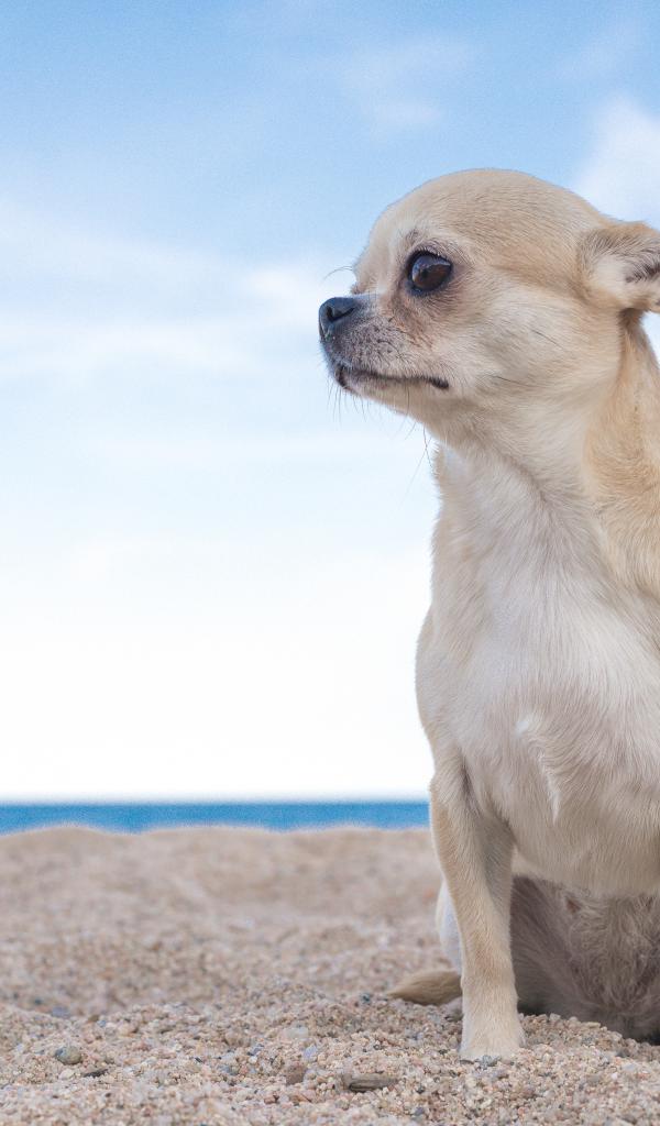 Wallpaper Sad chihuahua sits on the sand by the sea