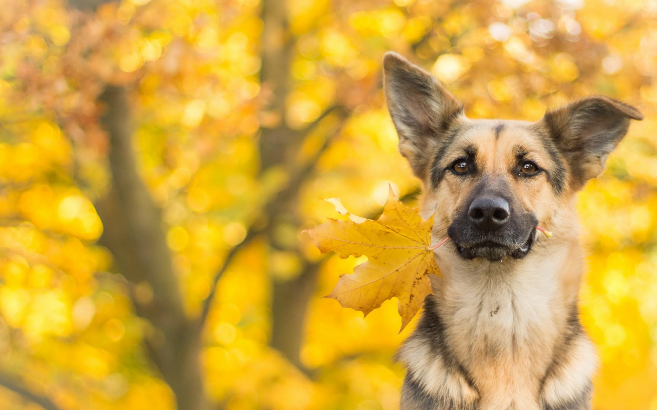 Wallpaper German Shepherd dog with yellow autumn leaf in the teeth