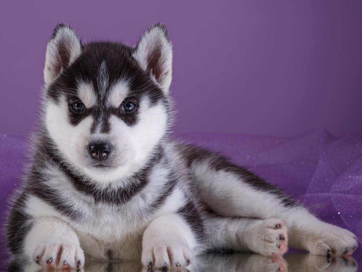 Wallpaper Serious Husky puppy lies on a purple background