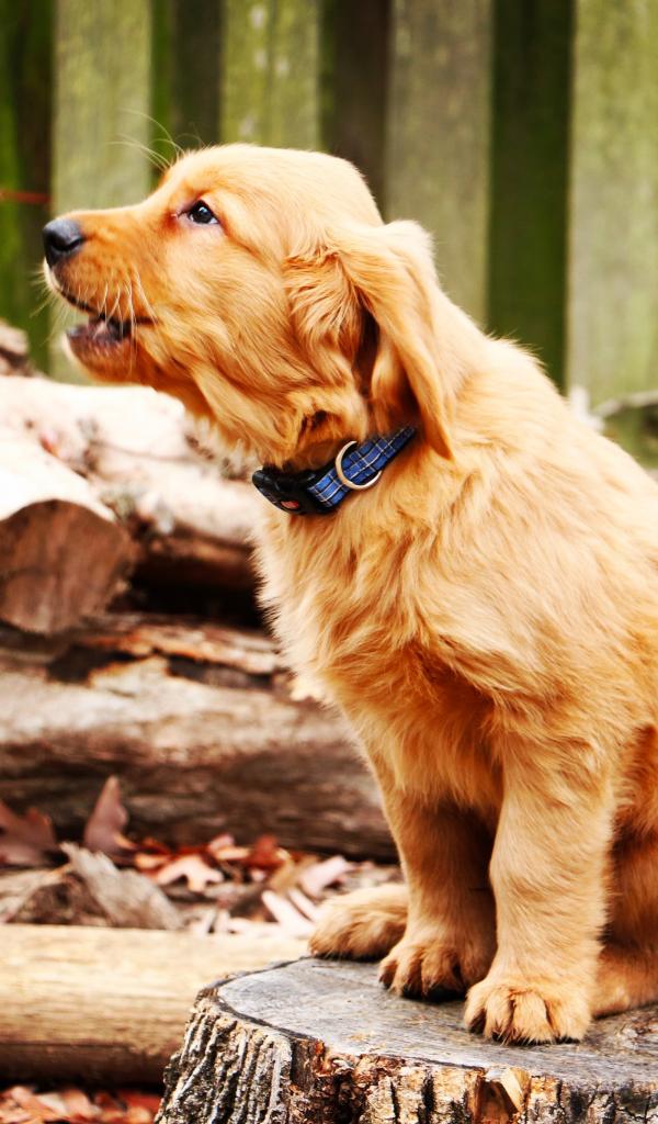 Wallpaper A puppy of a golden retriever sits on a stump