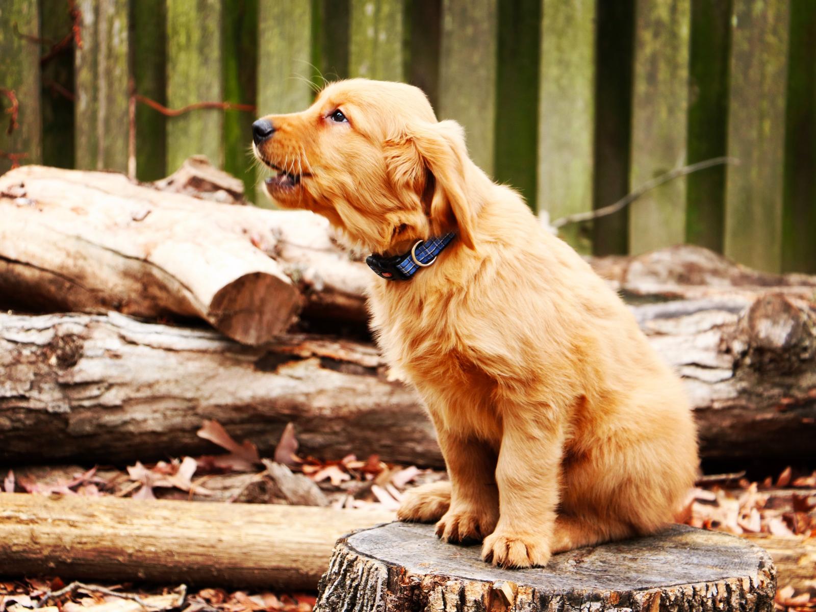 Wallpaper A puppy of a golden retriever sits on a stump